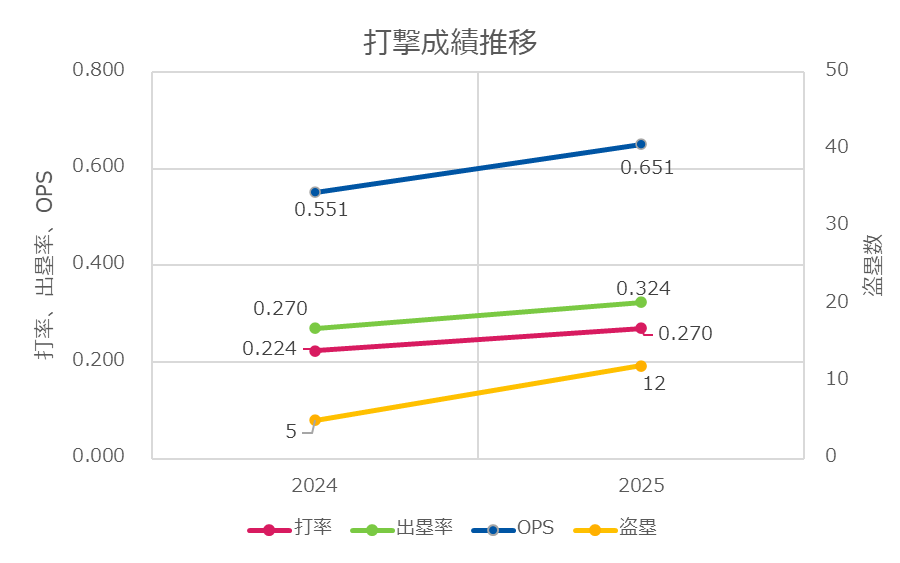 田中幹也選手のプロ初出場となった2024年と2025年の打率、出塁率、OPS、盗塁数をグラフに整理してみました。